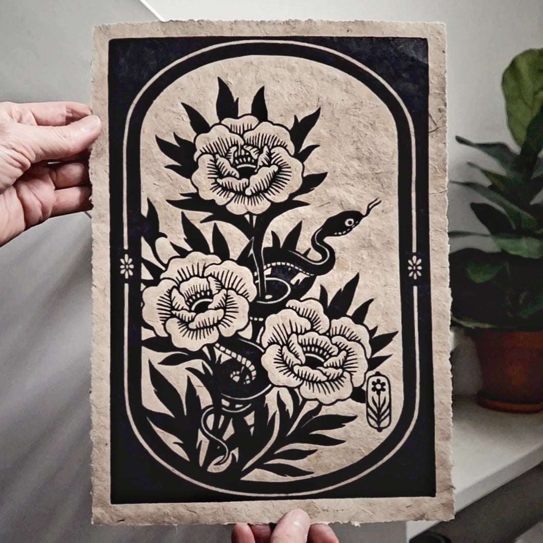 A garter snake winds through peony flowers in a design, inspired by Japanese Mokuhanga prints. Set against a beige background and framed with a decorative oval border, the image is printed on high-quality, sustainably sourced handmade paper that gives the piece an earthy, vintage appearance.